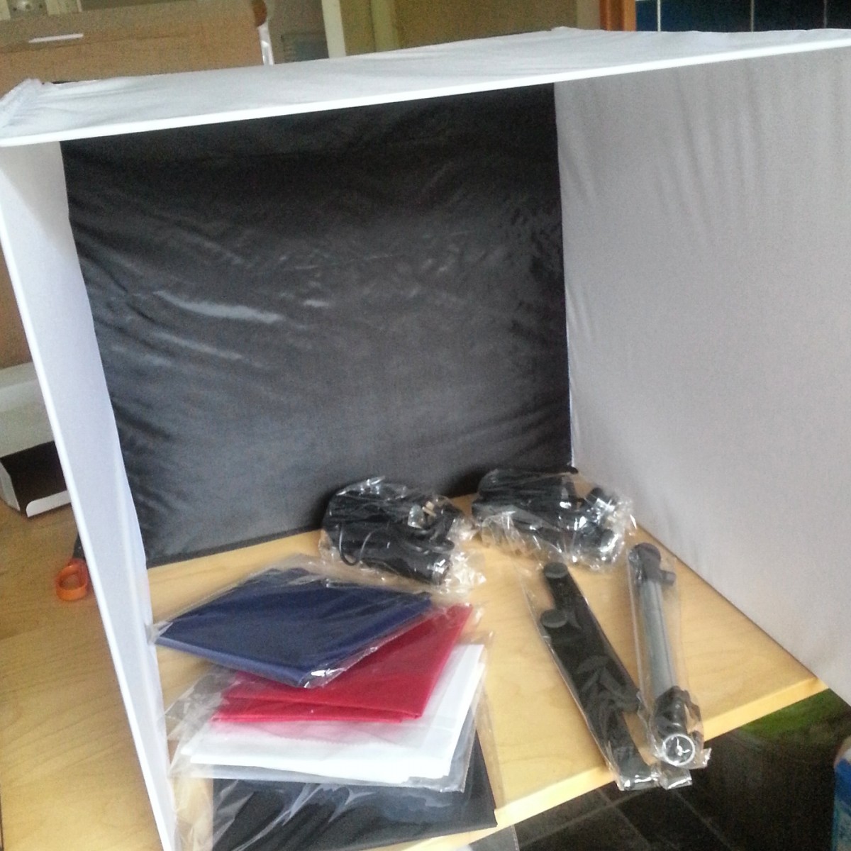 It’s a photo tent, with two lights, a camera stand and a bunch of backgrounds. Cool, isn’t it?