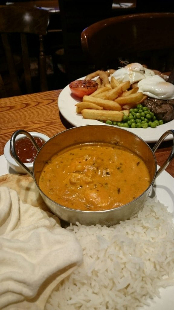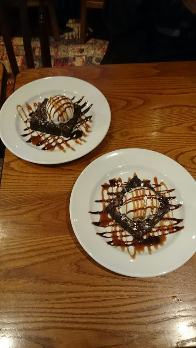 I *did* have a piece of paper, once upon a time, that explained the pricing that allowed us to get our food for such good value. I’ve no idea where that is now 🙁 But we got 2 for £12 deals on the two main meals, if I remember correctly, and then the desserts were on a 2 for £2.50 (seriously!) so we had 4 desserts between the four of us, and the brownies in particular were very good. (I was rather tempted by the sharing plate of desserts as well – we might have to go back and try that sometime. Pictured above is my chicken curry, which was good, and Tim’s mixed grill which made him very happy, particularly as he ordered the steak rare, and that was how it actually came. (Doesn’t happen often, so definitely worth noting when it does.)