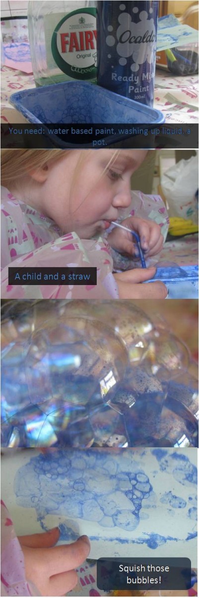 Bubble art is great fun. You can print over on the same paper with different colours, cut the bubbles out and use in collages, use it as wonderful hand made wrapping paper – the choice is yours!