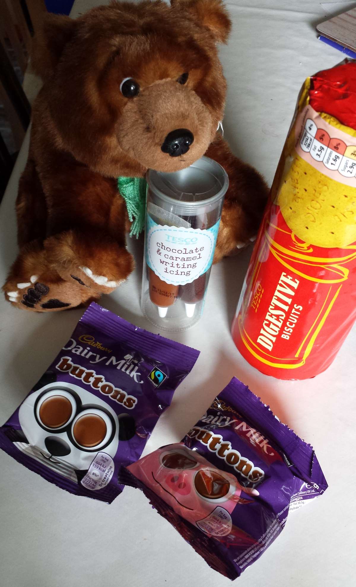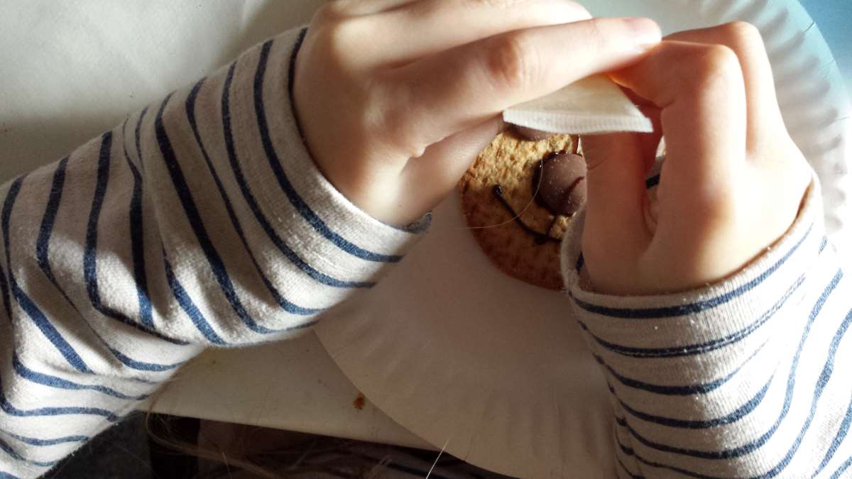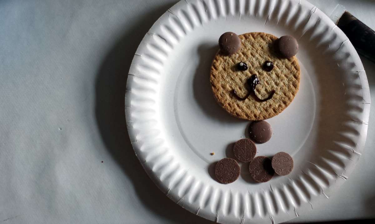 Then we decorated bear biscuits, which was a surprisingly popular activity, even drawing in oldest teen. It’s a really easy one as well, all you need is icing, buttons and digestives or another round biscuit of your choice. (You could be posh and bake the cookies yourself of course, but I wasn’t quite that organised…)