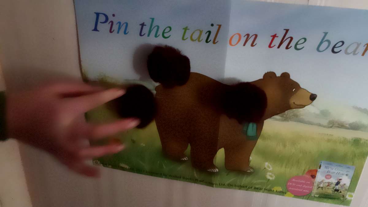 After biscuits, we played stick the tail on the bear, which was great fun. You could easily do this for yourself if you draw out a bear picture. Double sided sticky tape or glue dots on pom poms make for good bear tails, as you can see here.