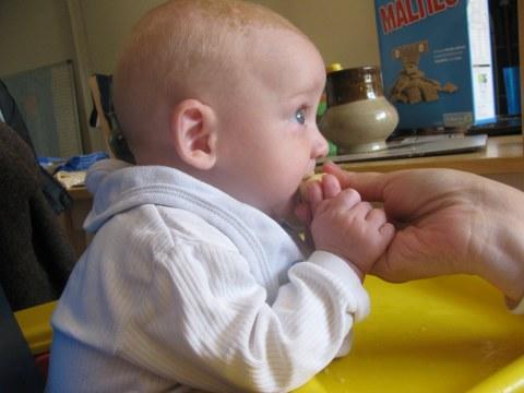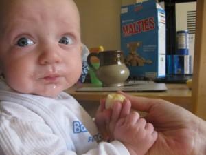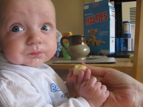 Tigerboy is very nearly 6 months old. He’s sitting up well by himself, negotiating things into his mouth and doing his very best to steal food off my plate. All signs of readiness for weaning. A couple of nights ago when we had (home made) cauliflower cheese I mushed a little bit and let him taste it – he spat it out very quickly, but I think it must have set the cogs whirring in his brain. Today I sat him in Smallest’s booster chair and handed him a lump of banana complete with skin, and this time there was no spitting out.