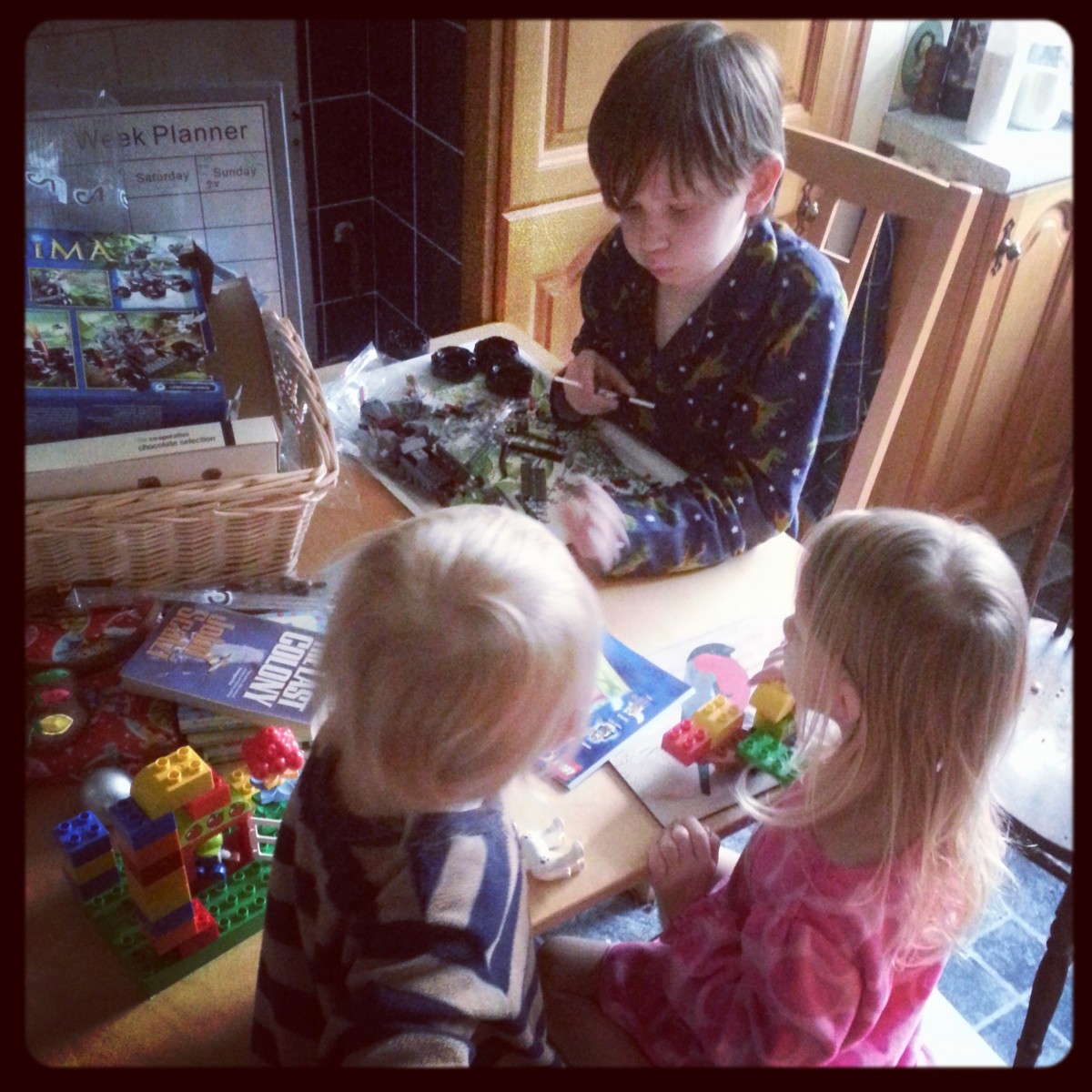 Big is four episodes into her NCIS box set. She has another 47 DVDs to go. That’s a whole lot of happiness. Tigerboy got another Tiger, who is quite adorable, and his first Duplo, and that is very good. As were board books and sticker sets, and the chocolates from the tree.