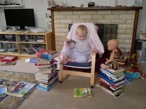 This time around, there are books everywhere (well, OK, there have always been books everywhere…) and reading goes on all the time. In the bathroom during nappy change, though I don’t let her take board books in the bath. Mean mummy 😉 Out in the garden. At the leisure centre. Wherever we are – there’s always a book or two in my bag, or she might even be carrying her own… There are also extra readers who both demonstrate the skillset in use on a near to daily basis and read to her as well.