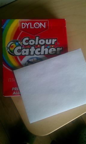 A little while back I was sent some Colour Catchers from Dylon. Nifty little bits of paper that you add to your wash that absorb stray dye instead of it floating around and dulling your other clothes. Like so.