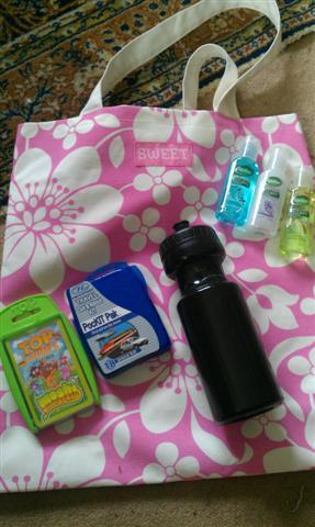 A very nice cloth tote bag, with three Radox hand gels (the kind of no water hand wash things), a pocket first aid kit, pack of moshi monster top trumps and a plastic water bottle.