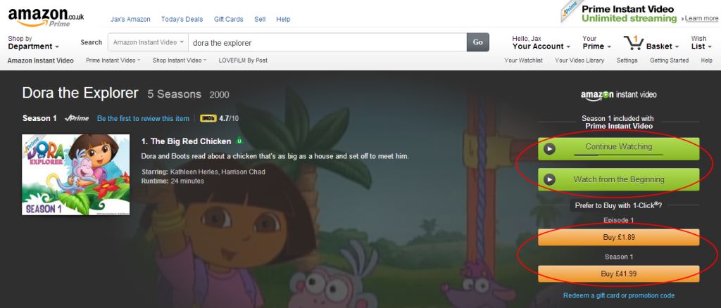 When using Amazon prime to stream video for your offspring, set a PIN against inadvertent purchases so that you do not receive emails telling you you’ve just paid £44 for Dora the Explorer that they should have been streaming for free.